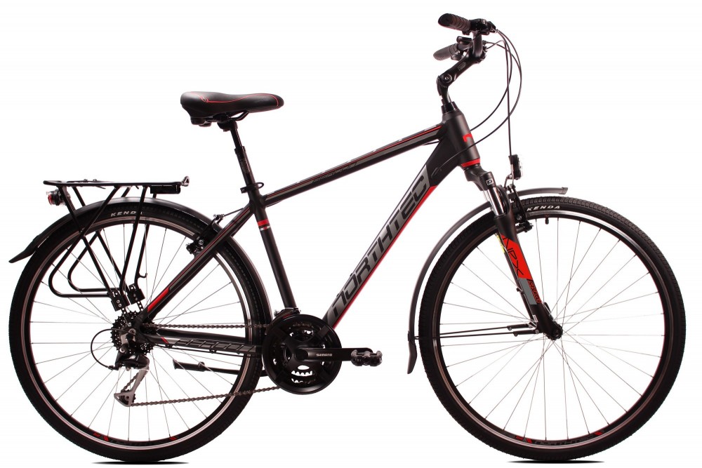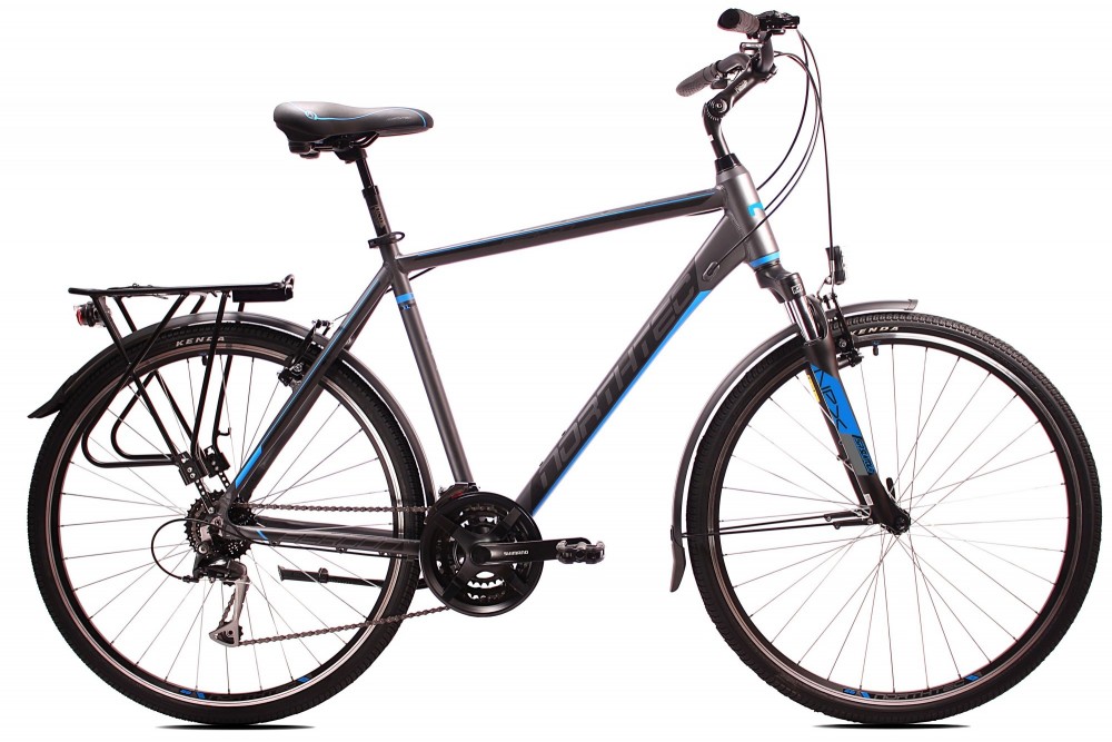 Solidny, wytrzymały rower trekkingowy dla amatorów turystyki rowerowej. Lekka hydroformowana rama aluminiowa o komfortowej geometrii, posiadająca system: Cable Inside Frame. Niezawodna grupa napędowa Shimano Alivio/Altus 3x8. Amortyzator Suntour NEX P 700C 63mm z regulacją skoku. Solidne, wzmacniane koła, zbudowane na piastach Shimano HB T500, szprychach Sapim. Amortyzowany wspornik siodła, szerokie wygodne siodełko elastomerowe. W podstawowym wyposażeniu zamontowany jest bagażnik aluminiowy, oświetlenie ledowe bateryjne, solidne błotniki SKS oraz podpórka.