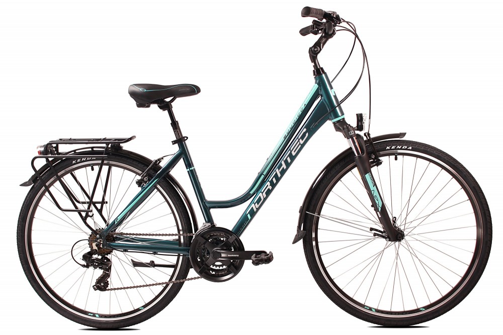 Solidny, wytrzymały rower trekkingowy dla amatorek turystyki rowerowej. Lekka hydroformowana rama aluminiowa o komfortowej geometrii, posiadająca system: Cable Inside Frame. Niezawodna grupa napędowa Shimano 3x7. Amortyzator Suntour NEX P 700C 63mm z regulacją skoku. Solidne, wzmacniane koła, zbudowane na piastach o łożyskach maszynowych, szprychach Sapim. Amortyzowany wspornik siodła, szerokie wygodne siodełko elastomerowe. W podstawowym wyposażeniu zamontowany jest bagażnik aluminiowy, oświetlenie ledowe bateryjne, solidne błotniki SKS oraz podpórka.