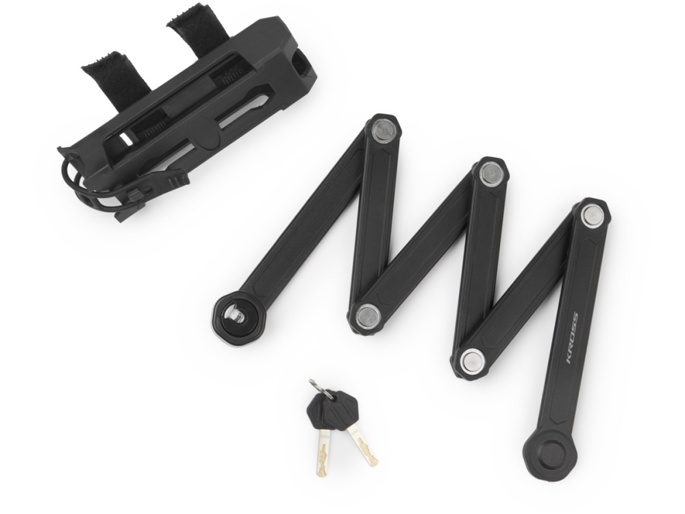 Składane zapięcie rowerowe Kross KZF 300 zostało wykonane ze stalowych paneli o grubości około 5 milimetrów, połączonych ze sobą za pomocą stalowych nitów. Panele wykończone zostały miękkim tworzywem sztucznym, które ma za zadanie głównie chronić ramę roweru przez możliwymi zadrapaniami czy też innymi uszkodzeniami mechanicznymi. Przeguby zostały zaprojektowane w taki sposób, że zapięcie jest naprawdę proste w składaniu oraz transporcie nawet w przypadku dłuższych wypraw rowerowych. Zabezpieczenie składane łączy wytrzymałość na poziomie U-Locka oraz elastyczność łańcucha, przy czym jest kompaktowych rozmiarów przez co łatwe w transporcie.